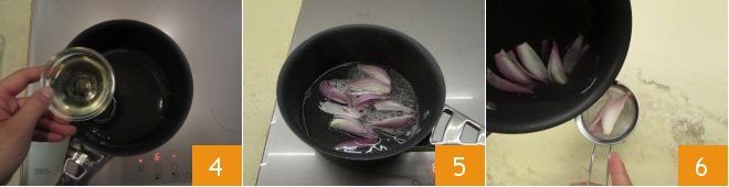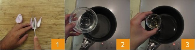 To prepare the fried poached egg with vegetables, bacon, and béarnaise sauce, first clean the shallot and cut it into wedges 1. Then pour the water into a small pot 2, and the vinegar 3.