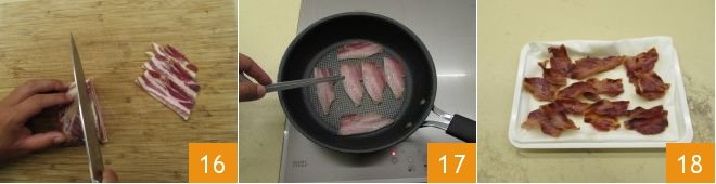 Meanwhile, also take care of the bacon. Cut it into thin slices about 1/16 inch thick 16 and brown them in a well-heated pan 17. When it is well browned, transfer it to a sheet of absorbent paper 18.