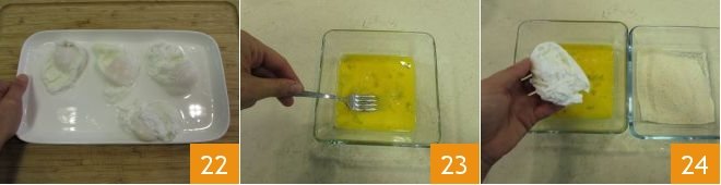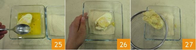 and use a spoon to turn it, so it is completely coated 25. Then pass it in the breadcrumbs 26 and use a slotted spoon to remove excess breadcrumbs 27.