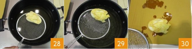 Fry them one at a time in hot oil at 374°F 28, measure the temperature with a kitchen thermometer. It will only take a few moments for each egg. As soon as the surface is golden, drain the egg 29 and transfer it to a tray with paper towels 30.