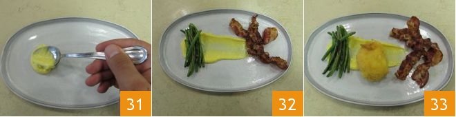 Fry all the eggs 28 and proceed to compose the dish. Spread a little béarnaise sauce in the center 31, place the bacon and green beans on either side of the plate 32, and finally the egg on top of the sauce 33.