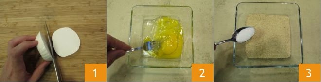 To prepare fried primosale, first cut it into slices 1. Depending on the size of the primosale you have, you can choose to make slices or cubes. Break the eggs into a small bowl and beat them 2, then pour the breadcrumbs into another small bowl and season it with a pinch of salt 3. Finally, put the flour in a third small bowl. Place a pot with oil on the stove and heat it until it reaches a temperature of 329°F.