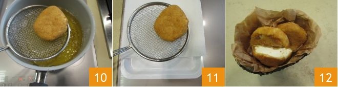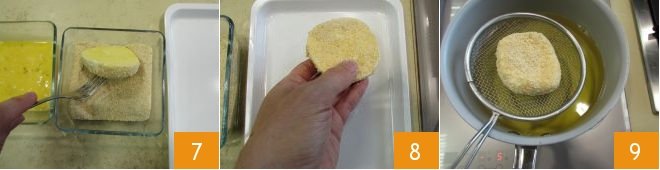 Finally, coat it in the breadcrumbs 7 ensuring it is well covered on all sides. Then transfer it to a tray 8 and continue with the other slices. Once the oil has reached the right temperature, immerse a few pieces at a time 9, so as not to lower the temperature too much.