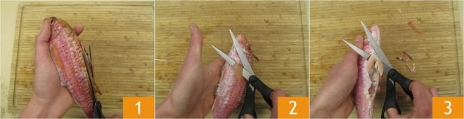 To prepare the fried red mullets with anchovy butter, clean the red mullets: remove the dorsal fins 1, the side fins 2, and the lower fins 3. It's important to use ungutted red mullets and be careful not to puncture the belly part.