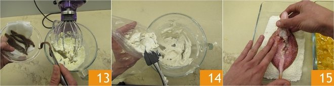 Then add the anchovy fillets 13 and continue to whip until they are dissolved and you have obtained a homogeneous cream. Then transfer it to a piping bag fitted with a star nozzle 14. Proceed to the breading of the red mullet, spread it, and pass only the inside in the flour 15.