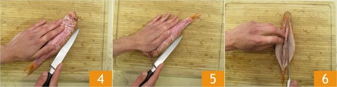 Now, as if you were to fillet it, cut along the back and slide the knife parallel to the bone 4. Do not go all the way to the bottom; you should only indicate it. Turn the red mullet over and do the same on the other side 5. Then spread the two fillets to detach them well from the central bone 6.