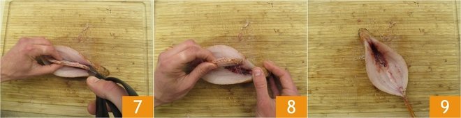 Now using scissors, cut the bone from both the head and tail ends 7. Remove it with your hands 8 and eliminate the internal entrails 9.