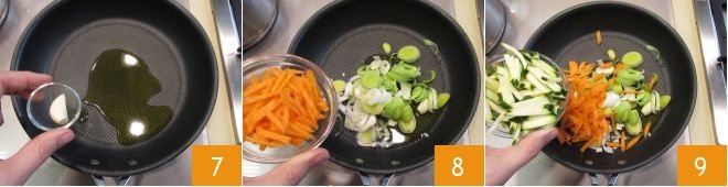 Meanwhile, cook the vegetables: in a large pan, heat a swirl of olive oil with the garlic clove 7, then add the leek, carrots 8, and zucchini 9.