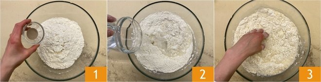 To prepare the fried stuffed sandwich, start with the pizza dough: in a large bowl, pour the flour and yeast 1, mix with one hand and gradually add the water 2, continuing to blend the mixture (you can also use a wooden spoon) 3.