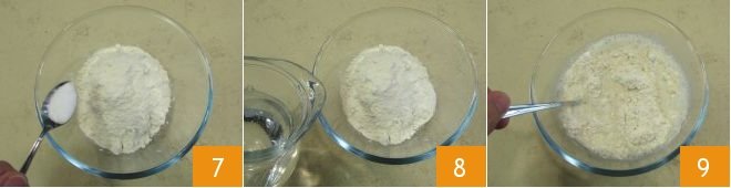 Finally, prepare the batter: pour the flour into another bowl, add the salt 7 and the water 8 and mix everything well 9.