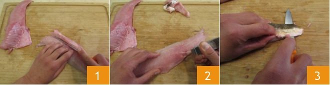 To prepare the fried tub gurnard, start with cleaning the fish fillets. Cut away the dorsal part where the central bone is, then the belly part with bones and cartilage 1. Detach the bones with the appropriate tweezers 2. Flip the fillets and make an incision with a smooth blade knife to facilitate peeling 3,