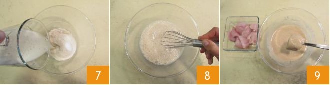 Add the beer 7 and mix with a whisk to avoid lumps 8: you should obtain a thick but fluid batter. Heat the oil to 302°F and dip a few pieces at a time first in the batter 9,