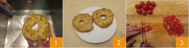 To prepare friselle with tomato and anchovies, first moisten the friselle with cold water 1, and place them on a plate 2. Wash the cherry tomatoes under running water and cut them into small pieces 3.