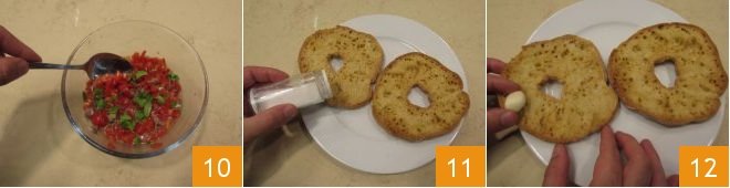 Mix well to combine all the ingredients 10 and set aside. Lightly salt your friselle 11 and rub them with the remaining garlic part 12.