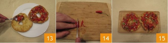 At this point, place the tomato and anchovy salad on the friselle, using a spoon 13. Remove the seeds from the chili pepper, cut it into strips 14, and place it on the friselle with cherry tomatoes and anchovies 15.