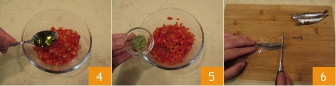 Pour the freshly cut cherry tomatoes into a bowl and season them with oil 4, salt, oregano 5, and black pepper. Cut the Marinated Anchovies into small pieces 6,