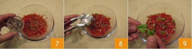 and add them to the tomato salad 7. Also add half the garlic clove, after crushing it 8, and the basil leaves, torn with your hands 9.