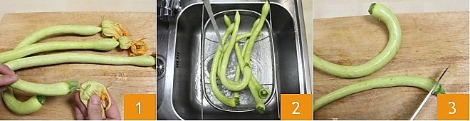 To prepare the trombetta zucchini fritters, start by removing the flowers carefully, eliminating the base with the pistil, and set them aside 1. Wash the zucchinis 2 and cut off the ends 3.