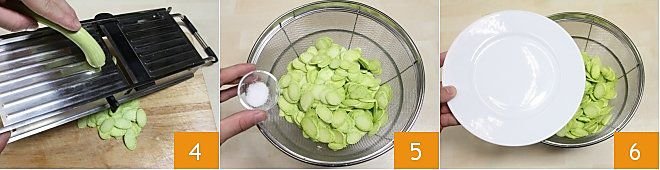 Cut the zucchinis into very thin slices (about 1 mm). To make this easier, you can use a mandoline 4. Place the zucchini slices in a colander, add two pinches of salt 5, mix them, cover with a small plate 6, and place a weight on top (such as a 2.2 lbs bag of sugar) to help them lose their excess water. Leave them like this for about half an hour.