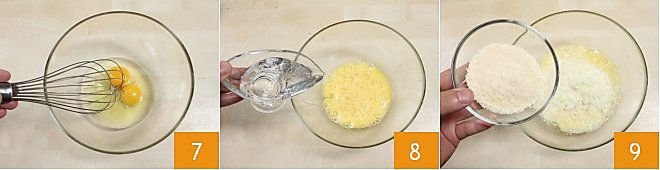 In the meantime, prepare the batter in a bowl by beating the eggs with a whisk 7, 150 ml of water (or milk) 8, grated Grana Padano DOP, and Pecorino cheese 9,