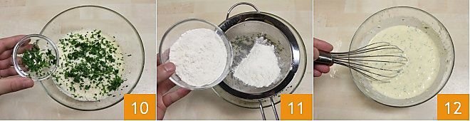 the chopped parsley 10, sifted flour 11, crushed garlic, and a pinch of black pepper. Whisk the mixture to combine the ingredients. You should have a smooth, lump-free batter.