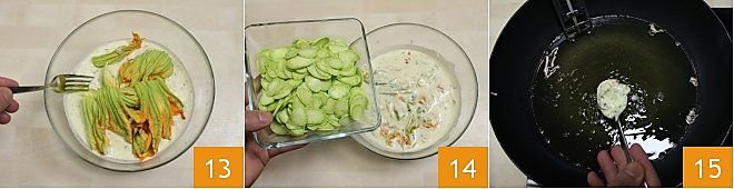 Add the whole zucchini flowers 13 to the batter, then the zucchinis 14: the batter should be thick, and if not, you can add a tablespoon of flour. Prepare a pan with plenty of oil, and put it on the stove; when the oil is hot (should reach 356°F), if you don't have a kitchen thermometer, check the temperature by dipping a teaspoon of batter into the oil 15: if it floats and starts frying, the temperature is right. Spoon dollops of the batter into the oil (the spoon should be about ¾ full), and fry the fritters on both sides.