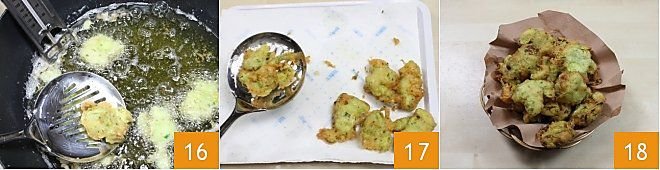 Remove them from the oil when they are golden using a slotted spoon 16, place them on kitchen paper towels 17 to drain excess oil. Once ready 18, serve the trombetta zucchini fritters and its flowers while still hot.