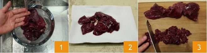 To prepare fusilli with chicken livers, start by preparing the Chicken broth which will be used for cooking the meat. Then move on to the livers: place them in a colander and rinse them under running water 1. Then transfer them to a tray lined with a dry cloth and pat them dry 2. Next, place the livers on a cutting board and chop them coarsely 3.