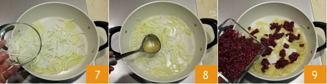 Leave the meat aside for a moment and prepare the sauté: peel and finely slice the onion 4, peel the garlic clove 5 and cut it in half to remove the green sprout inside. Then in a large pan, pour a drizzle of oil, add the garlic 6 and let it brown.