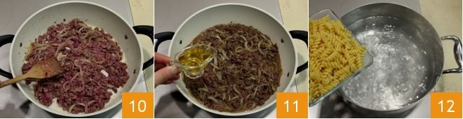Salt to taste, stir 10, and deglaze with the brandy 11: cook the livers for a few minutes over high heat, 4-5 minutes will suffice to brown and flavor the meat. Then bring a large pot of water to a boil for the pasta and add the fusilli 12.