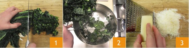 To prepare the gratinated fusilloni with black kale and Pecorino, start by washing the black kale leaves well, removing the end of the stalk where there are no leaves. Then finely chop the part of the stalk with fewer leaves and gradually make the cuts coarser towards the leaves: this way, the cooking of the black kale will be uniform 1. Place it in a pot with salted boiling water and boil it for about 25 minutes 2. Meanwhile, you can focus on the Pecorino cream: grate it finely 3.
