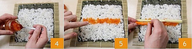 Take about a tablespoon of fish roe 4 and place it in the center of the rice 5, then arrange the sticks of various ingredients in any way you like 6, remembering that futomaki requires at least 4 ingredients inside.