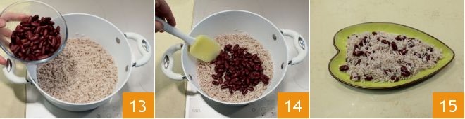 then drain the red beans from their preserving liquid 7 and add 4.4 oz to the rice 8, along with the remaining water 9.