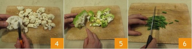 and separate the florets, also removing the excess stalk 4. Do the same for the Romanesco broccoli 5. Finally, after washing and trimming the ends off all the green beans, cut them into 2 or 3 parts depending on their length 6.