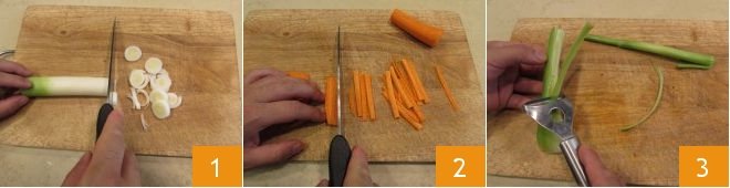To prepare the garden-style fusilli, start by cleaning the vegetables: rinse and dry them. Take the leek. Remove the green tops and, after making a lengthwise incision with a knife, remove the outer layer. Then slice it into thin rounds 1. Move on to the carrots: peel them and cut into slices, then into sticks 2. Now peel the celery 3