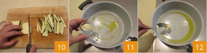 From these slices, cut thin sticks 10. Now everything is ready for cooking. In a deep pot pour the water for the pasta, bring it to a boil and salt. In the meantime, take a nonstick skillet. Drizzle in the oil and sauté a clove of garlic 11. When it turns golden, remove it 12.