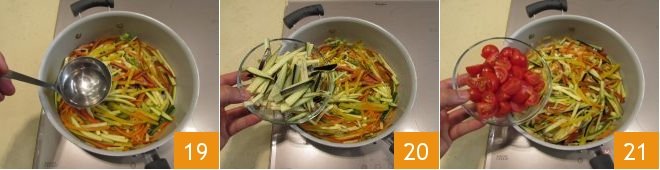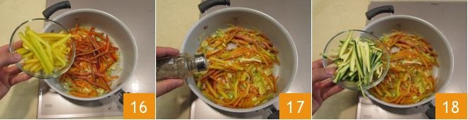 and the yellow ones 16. Season with salt and pepper 17 and cook over moderate heat for 3–4 minutes. Add the zucchini 18.
