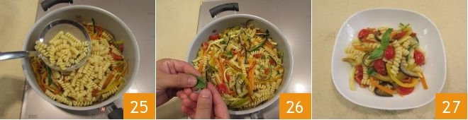When there are 3 minutes left of the pasta's cooking time, transfer it directly into the pan with the vegetables using a slotted spoon 25. Toss the pasta, mixing it with the sauce for another 3 minutes. Turn off the heat and scent with roughly torn basil leaves 26. Plate your garden-style fusilli and enjoy 27!