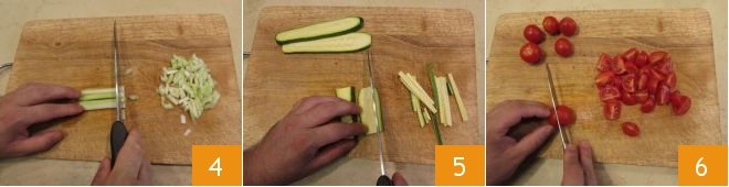 and chop it finely 4. Take the zucchini, slice them, then cut into thin strips 5. Cut the tomatoes into quarters 6.