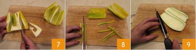 Move on to the yellow bell peppers: halve them, remove the green stem and the white ribs 7. Cut them into thin strips 8. Repeat the same for the red bell peppers. Now take the eggplants: remove the stem, then slice them 9.