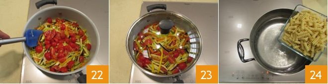 Pour in a ladleful of the pasta cooking water 19 to help the vegetables cook evenly. Finally add the eggplant 20 and the tomatoes 21.