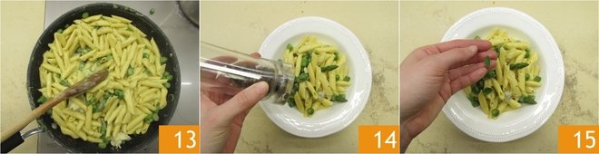 Mix well 13 and serve the garganelli with asparagus and gorgonzola hot, with pepper to taste 14 and marjoram leaves 15.