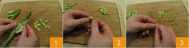 To make garganelli with fava beans and speck, start by preparing the Vegetable broth. In the meantime, proceed to clean the fava beans by shelling them 1: with the pods, you could prepare a tasty Sautéed Broad Bean Peels. Then remove the small growth above each fava bean 2 and set aside the more tender ones, while you can peel the larger ones, meaning those with a more resistant skin 3: this way, you will have the sweetest and tenderest part of the seed.