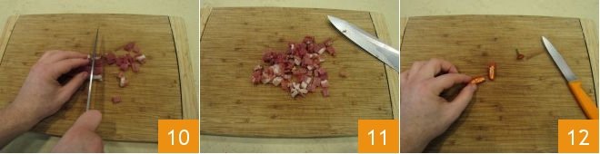 Meanwhile, cut the speck into horizontal and vertical strips 10 to obtain cubes no larger than ½ inch 11; remove the top of the chili pepper and cut it in half 12,