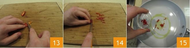 with the fingers of one hand, hold the tip of the chili pepper and with the other hand, in which you hold a knife, slide the blade in the opposite direction to the seeds 13 and then cut into thin slices 14: this way, you'll have just the aroma of the chili pepper without spiciness. In another pan, pour the remaining 2 tsp of oil along with the chili pepper 15