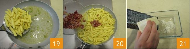 When the garganelli are exactly halfway cooked, drain them and pour them into the pan where you cooked the fava beans 19 (if necessary, add a bit of pasta cooking water) and continue cooking for the necessary time, also adding the speck with the chili pepper 20. In the meantime, grate the pecorino cheese 21
