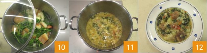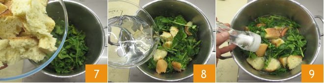 Finally, add the stale bread broken into pieces with your hands 7 and mix well. Pour water into the pot to cover all the ingredients 8 and add salt 9.
