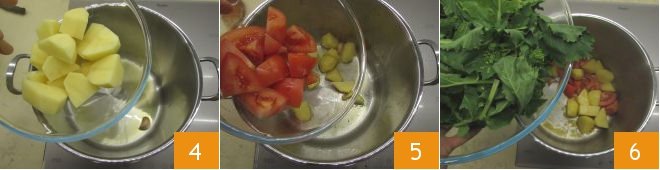 Heat a drizzle of oil in a large pot and briefly sauté the garlic clove with its skin on, then add the potatoes 4, tomatoes 5, and turnip tops 6.