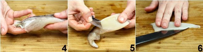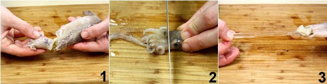 Clean the squid by removing the head 1 and separating it from the tentacles with a cut near the eye 2. Then remove the central tooth (it will come out by squeezing the tentacles). Next, extract the transparent cartilage from the pouches 3.