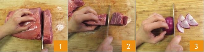 To prepare the ghormeh sabzi, first cut the piece of meat into slices 1-1.5 inches thick 1, then cut them into cubes 2. Peel the red onions and slice them thinly 3.